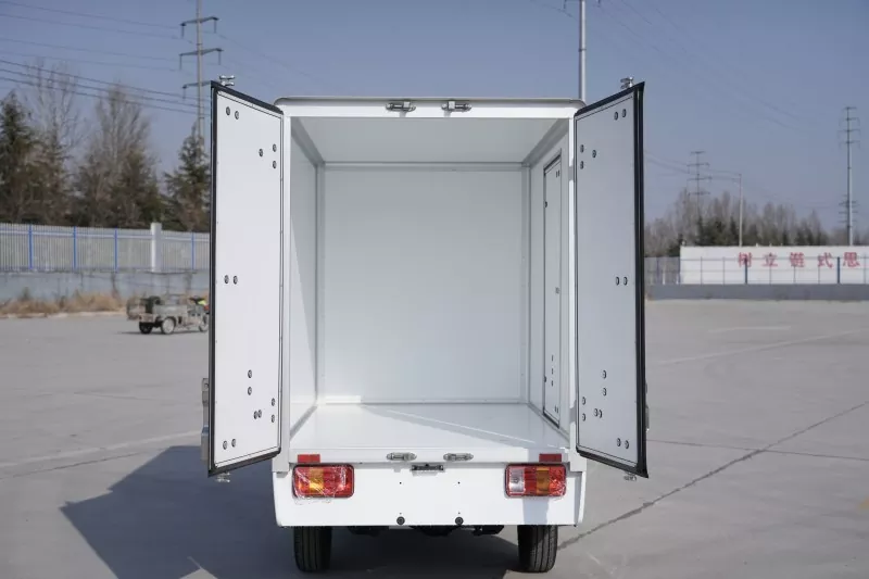 Closed cargo box, with strong sealing, can protect goods from weather conditions; The rear is equipped with a double door structure, and there is also a door opening design on the side, which facilitates multi-directional loading and unloading of goods and improves usability.